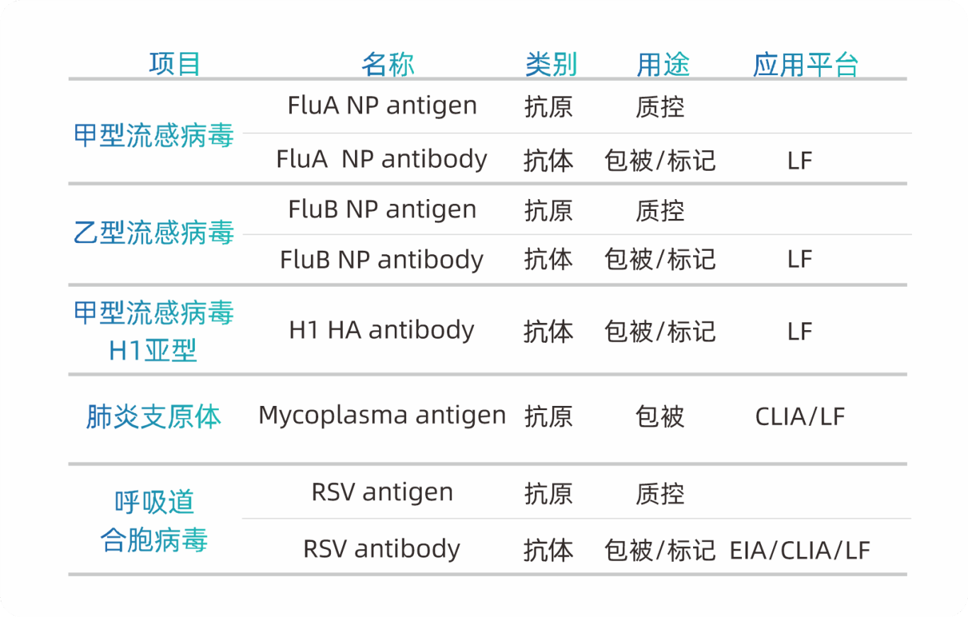 华葵金配在呼吸道检测原料领域已建立起全面而系统的产品矩阵。面对近年来同样呈高发态势的肺炎支原体(MP)、呼吸道合胞病毒(RSV)等常见病原体,华葵金配持续投入研发与产品迭代,在灵敏度、特异性与稳定性方面均达到行业领先水平,相关产品如下: